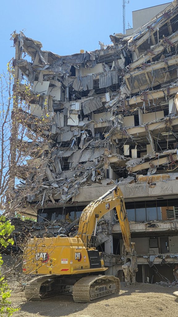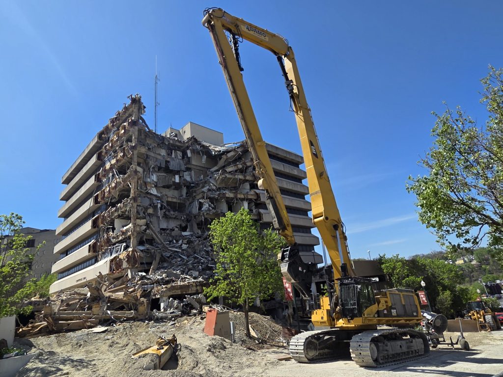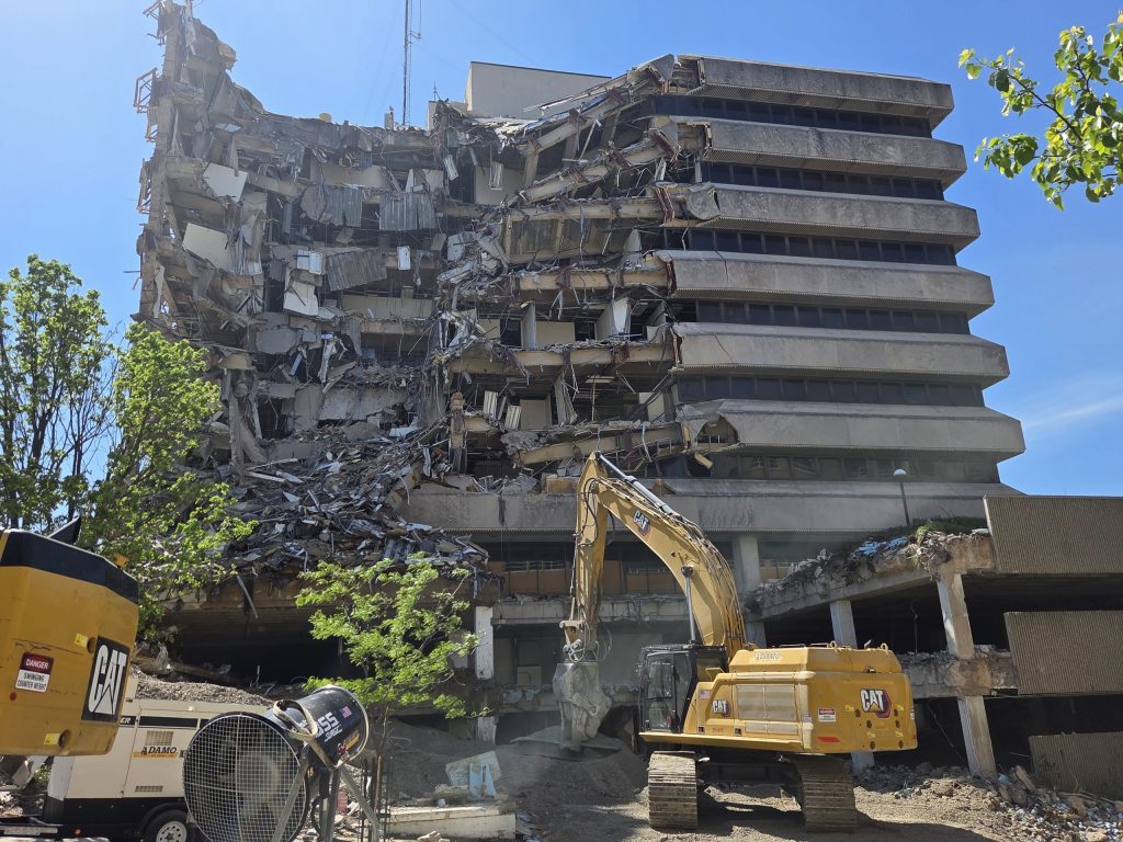 Heavy machinery is slowly chipping away at the Courthouse Square building in Washington as the demolition work continues on the former county government offices that will eventually become the site for the new public safety building. [Mike Jones]