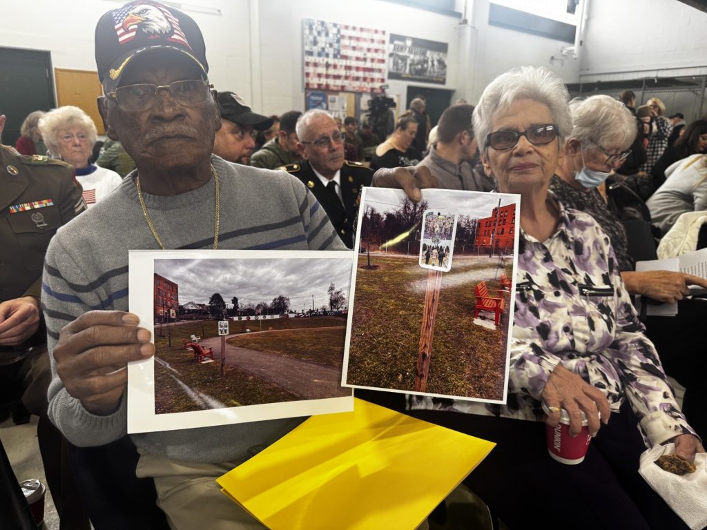 During Wednesday’s service, Madison sat in the front row holding two large photos of the Anthony E. Madison Veterans Memorial Park in Monessen.