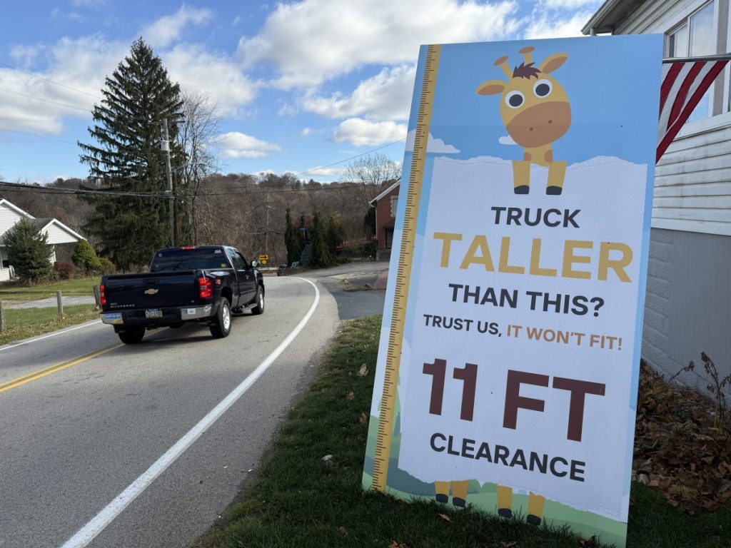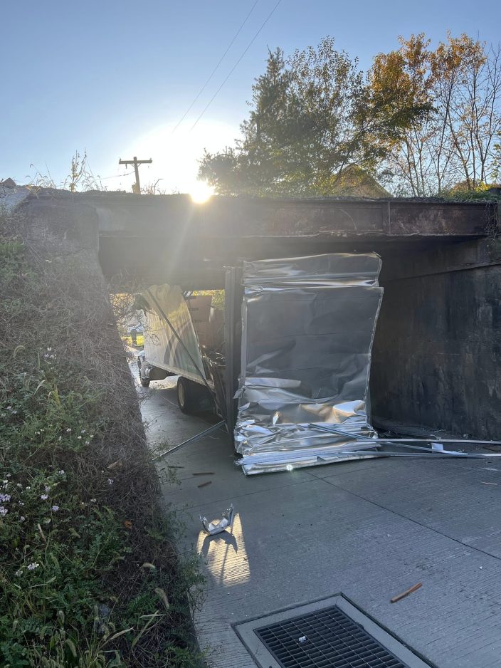 The so-called “Georgetown Scalper” is in the 500 block of Georgetown Road near where it turns into Valley Brook Road. It has long been an issue for the area with the drivers of box trucks and 18-wheelers failing to heed warnings about 11-foot clearance and getting stuck.