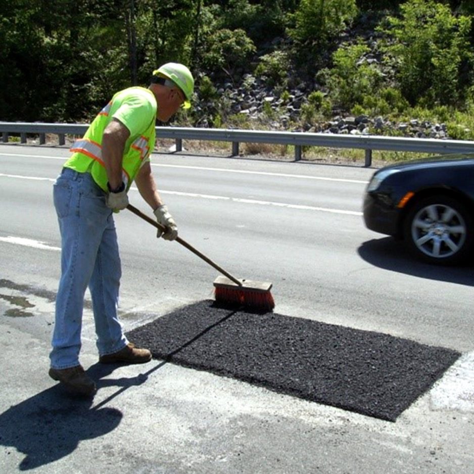 During the winter, repair crews use cold patch – asphalt mixed with soap, water, and fine stones that allow the material to remain flexible and easier for crews to work with.