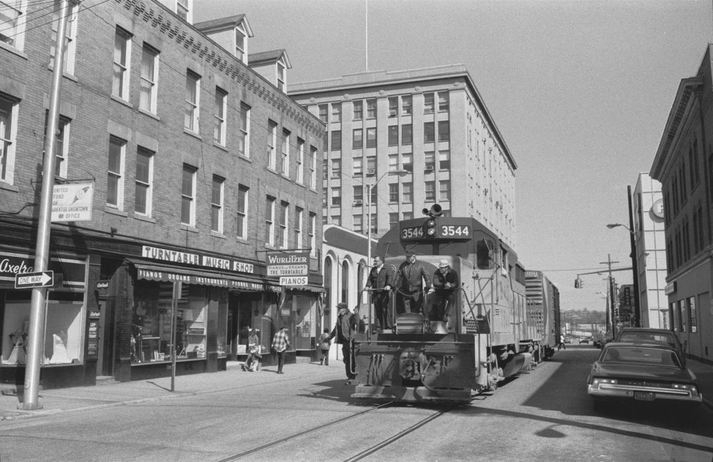 Shown is a picture of Beeson Boulevard in 1976 compared to how the street looks today. The railroad tracks down the center of the street have stood the test of time, bustling with activity decades ago, while trains continue on the track only occasionally today. One obvious change is the building on the left, which used to house the Turntable Music Shop in the 1970s. The space now serves as the First Federal of Greene County bank. In the older picture, a lighter-colored building on the right stands tall, now gone and replaced with statues of Thomas Jefferson and Albert Gallatin as they look westward. The statues, unseen in the updated picture, are a part of a series of sculptures in Somerset, Fayette and Washington counties that offer a unique way to tell the story of the National Road. (Submitted photo courtesy of W. Keith McManus. Color photo by the Herald-Standard.)
