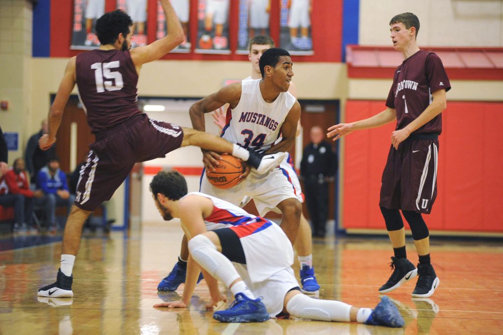 Bryce Laskey scored three of his game-high 22 points to extend the Mustangs’ lead to 12-2. Laskey scored 14 points in the first on four field goals, including two 3-pointers, and was 4-of-4 at the foul line. Laskey made seven field goals, including two 3-pointers and was 6-of-7 at the line.