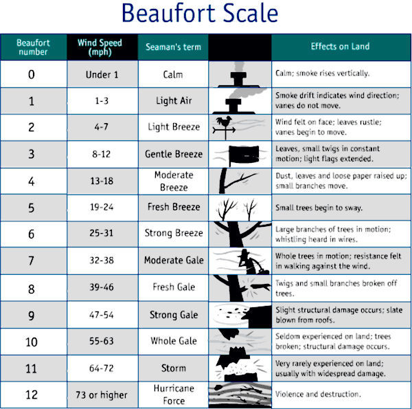 To measure the wind, we use an Anemometer; however, a lot of the time, we do not have access to this type of equipment, and in 1805, Sir Francis Beaufort developed the Beaufort scale for the British Royal Navy using simple visual signs to estimate the wind speed, such as smoke rising or tree branches moving.