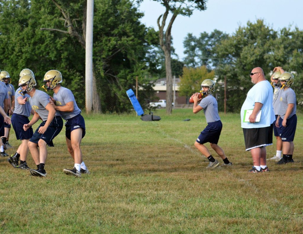 “We’ve got four of the five back on the offensive line,” Kuhns said. “Evan Dreucci and Jacob Baker are our guards. They both have two years experience. Jacob Housel, all 5-9, 160 pounds of him, is our center. I’d put him up against anybody, pound for pound. Our left tackle, Chris Pohill is back. The only hole we had to fill was right tackle and Dalton White, a first-year kid who blocks out the sun he’s so doggone big (6-5, 260), is doing a pretty good job for us there.”