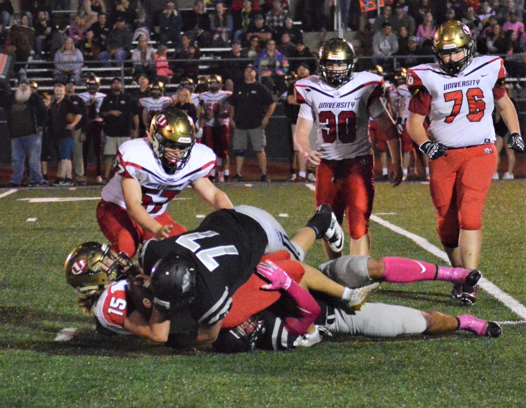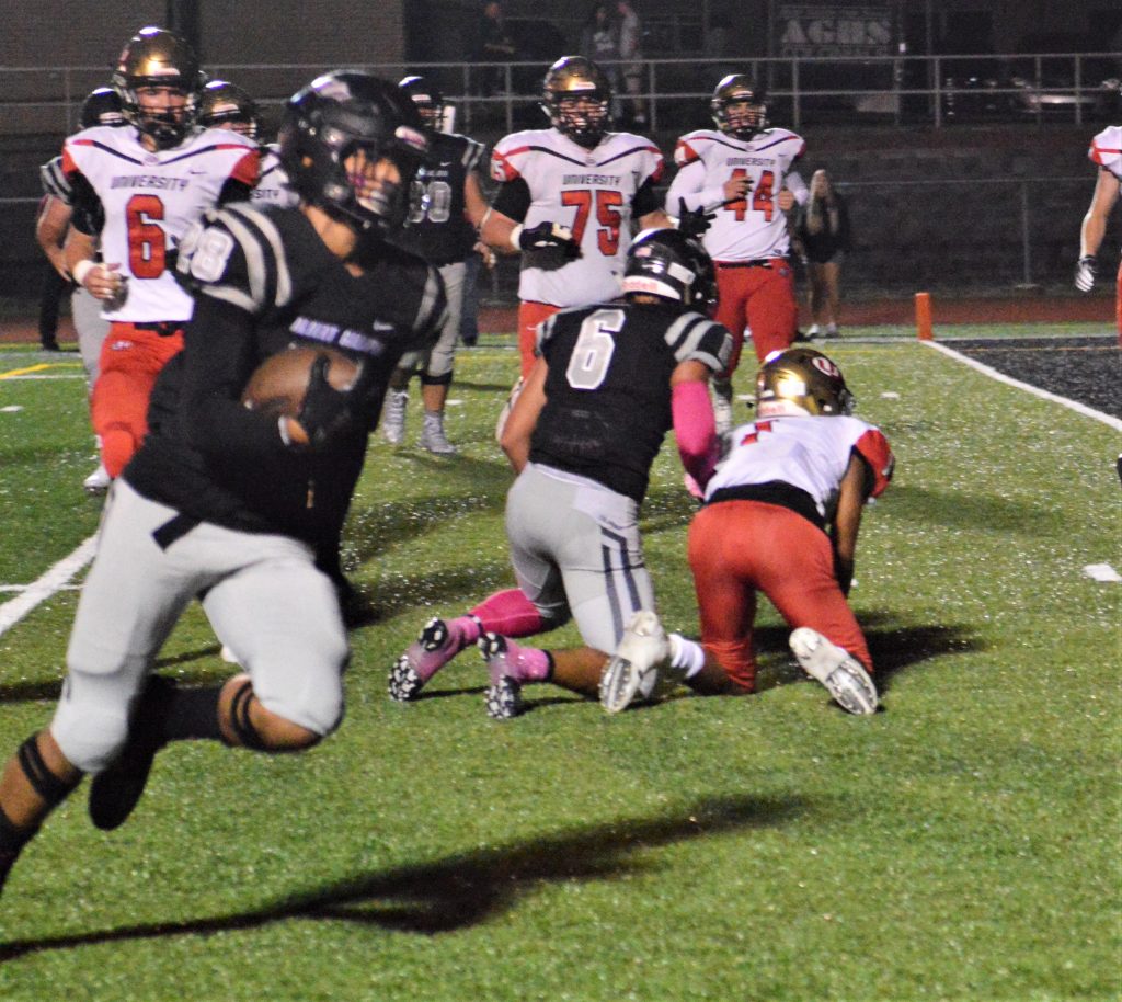 University High finally got on the board late in the third quarter when Logan Raber followed a 21-yard scramble by Edwards with an 11-yard touchdown run, but AG stopped Raber on the two-point run attempt to keep the score at 13-6.