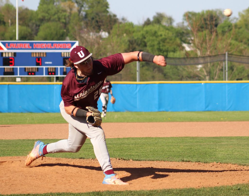 Jim Downey | Herald-StandardUniontown’s Tate Musko fires a pitch in the bottom of the fourth inning in Monday’s Section 2-AAAA game at Laurel Highlands. Musko didn’t allow a hit in six-plus innings in the Red Raiders’ 14-3 win.
