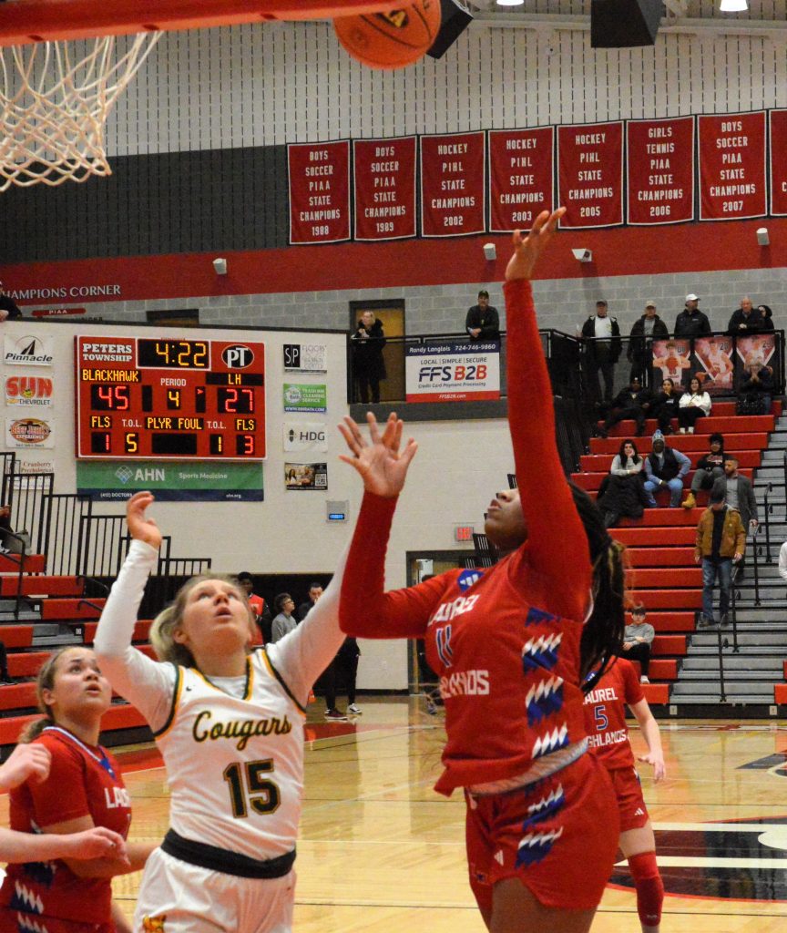 Aubree Hupp scored a game-high 27 points and the Lady Cougars made 15 of 18 free throws in knocking off the eighth-seeded Lady Mustangs, 59-32, in their WPIAL Class 4A quarterfinal playoff game at Peters Township High School’s AHN Arena Thursday night.