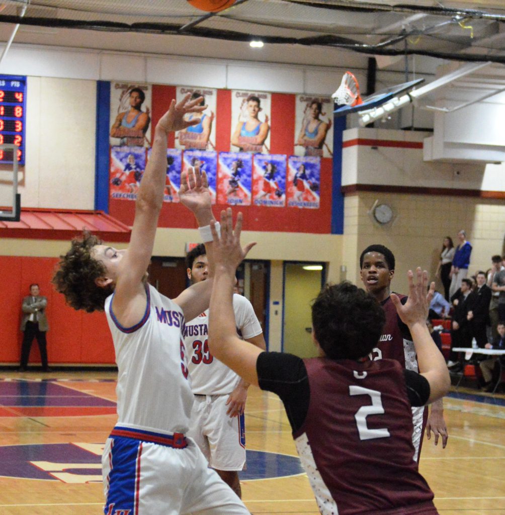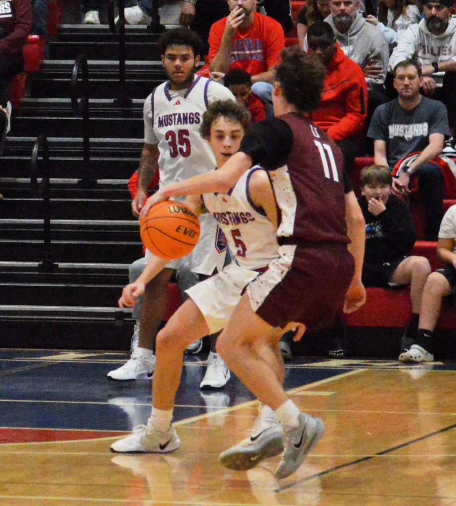 The Mustangs (2-4, 8-5) trailed 47-37 after three quarters but trimmed the deficit to five when a 3-pointer by Nick Crouch made it 53-48. After both teams made one of two free throws, Baker swished his third 3-pointer with 3:31 left to put the visitors ahead 57-49.