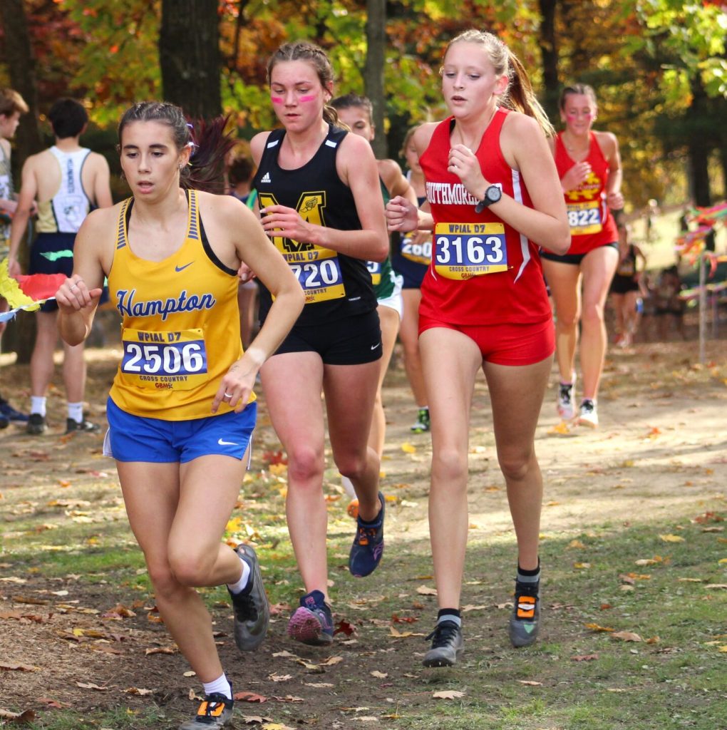 Jim DowneySouthmoreland junior Lexi Ohler (right) keeps pace with a couple runners during the 2023 WPIAL Class AA Cross Country Championship at White Oak Park.