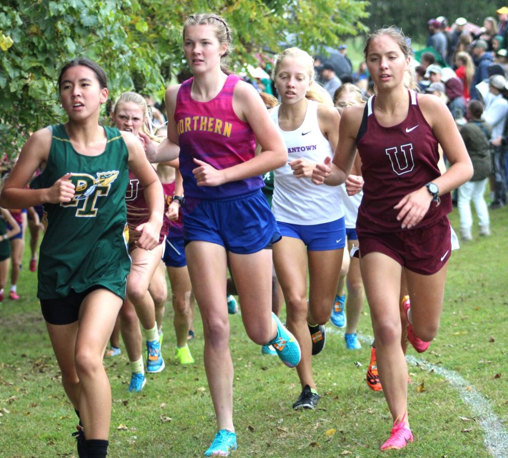 Jim DowneyUniontown’s Emily Angelo (right) runs with a pack off runners early in the 2023 A.J. Everhart Invitational at Penn State Fayette.