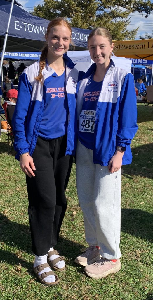 Laurel Highlands’ Taylor Schwertfeger (left) and Bella Baker pose after competing on Saturday at the state cross country meet in Hershey.