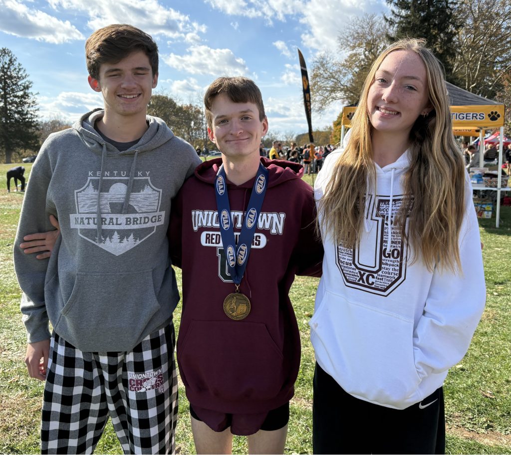 Uniontown's Logan Davis (left), Ethan Syner and Charley Murtha competed in the PIAA cross country championships on Saturday in Hershey.