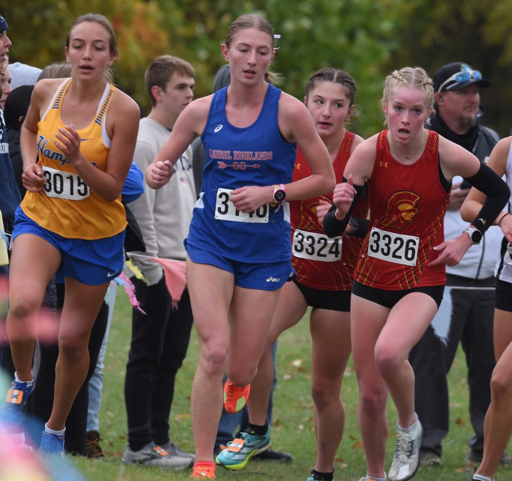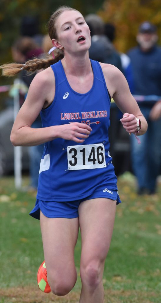 WHITE OAK — Laurel Highlands senior Bella Baker led a group of five local runners who qualified for the state meet after crossing the finish line in fifth place on Thursday in the Class 2A girls race during the WPIAL Cross Country Championships at White Oak Park.
