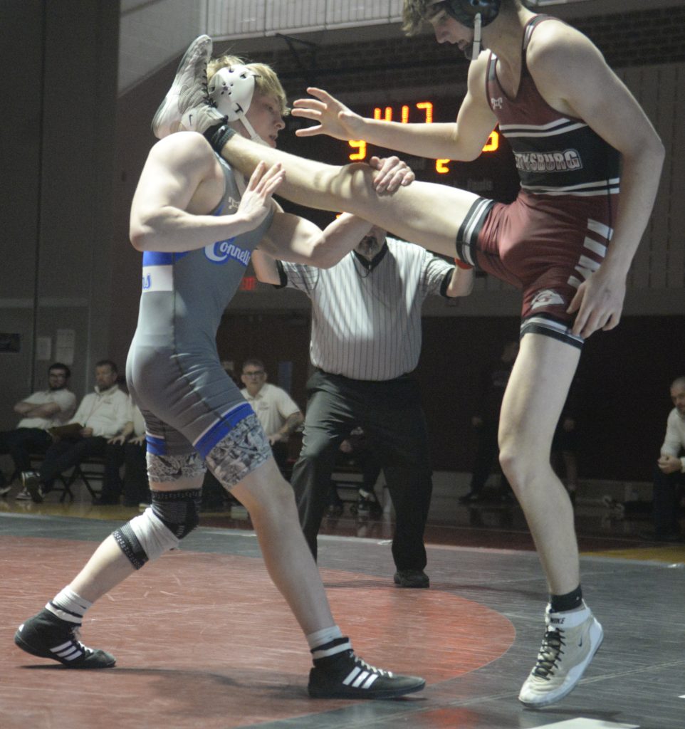 Following Jake Lilley’s 12-2 major decision and Connellsville assuring itself a victory in the first round of the PIAA Class 3A dual meet tournament, the Falcons competed in one bout before forfeiting the last three weights in a 34-33 triumph over Gettysburg on Tuesday night at Gettysburg High School.