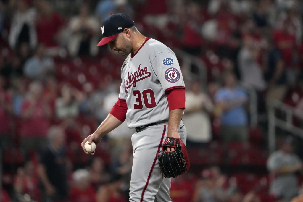 Washington Nationals relief pitcher Paolo Espino pauses on the mound after giving up a solo home run to St. Louis Cardinals' Nolan Arenado during the eighth inning in the second game of a baseball doubleheader Saturday, July 15, 2023, in St. Louis.