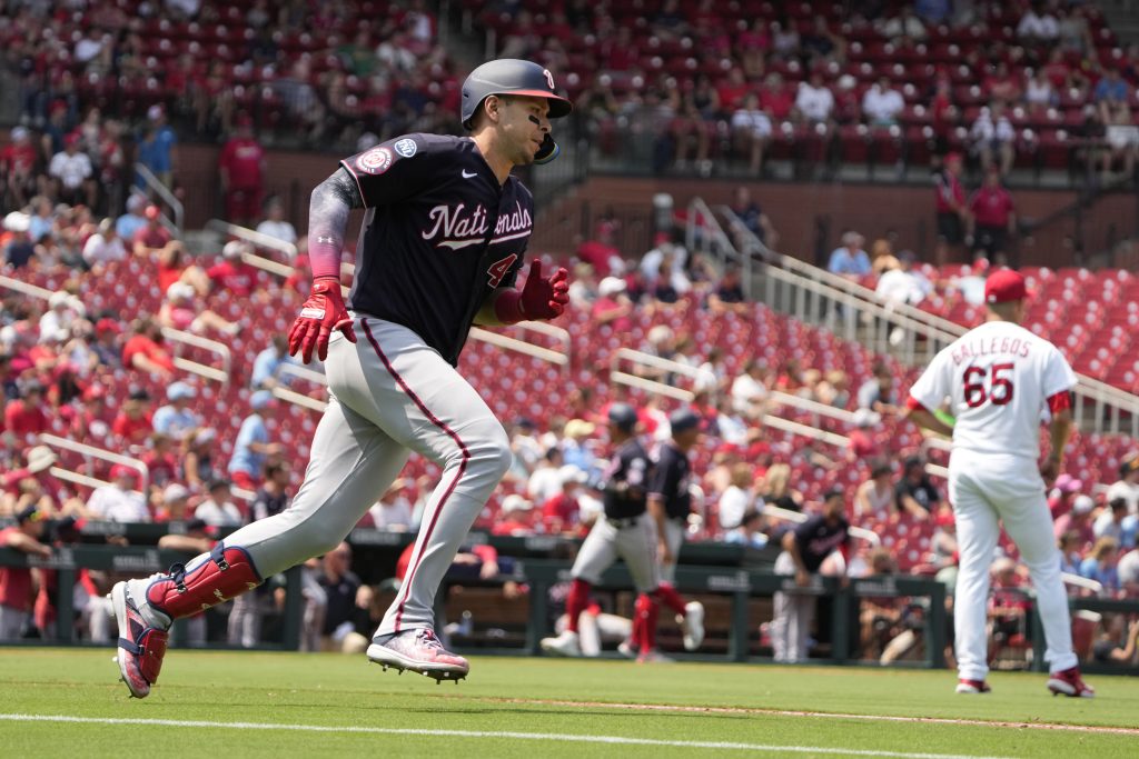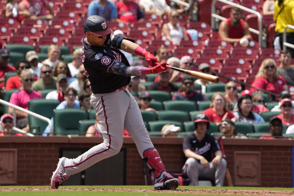 Washington Nationals' Lane Thomas follows through on an RBI single during the 10th inning in the first game of a baseball doubleheader against the St. Louis Cardinals Saturday, July 15, 2023, in St. Louis. The contest was the resumption of a game started on Friday, but was suspended due to rain.
