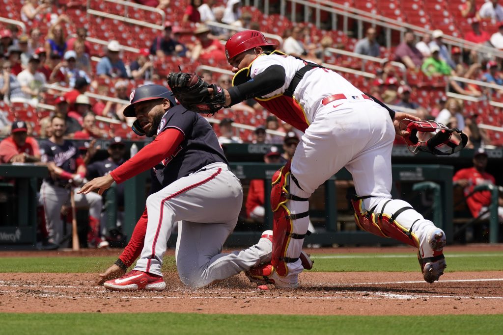Washington Nationals' Dominic Smith (22) is safe after scoring ahead of the tag from St. Louis Cardinals catcher Willson Contreras during the fifth inning in the first game of a baseball doubleheader Saturday, July 15, 2023, in St. Louis. The contest was the resumption of a game started on Friday, but was suspended due to rain.