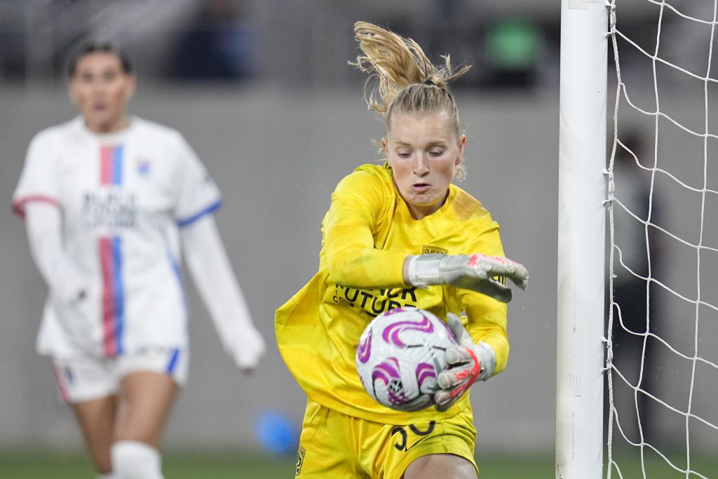 OL Reign goalkeeper Claudia Dickey blocks a shot during the second half of an NWSL semifinal playoff soccer match against the San Diego Wave, Sunday, Nov. 5, 2023, in San Diego.