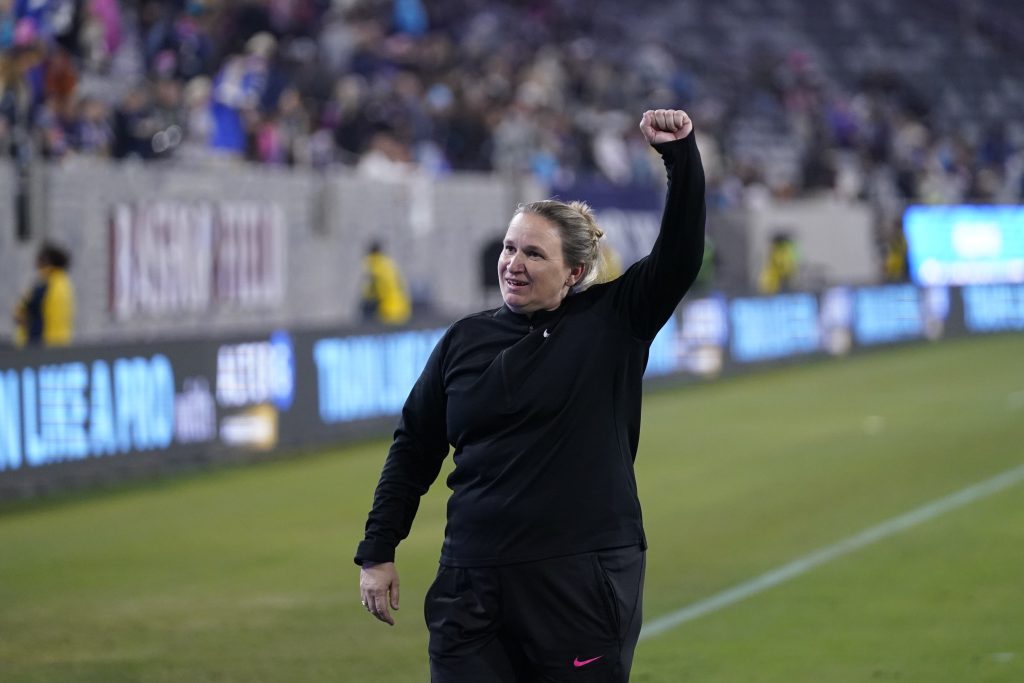 OL Reign head coach Laura Harvey celebrates after the OL Reign defeated the San Diego Wave 1-0 to win an NWSL semifinal playoff soccer match Sunday, Nov. 5, 2023, in San Diego.