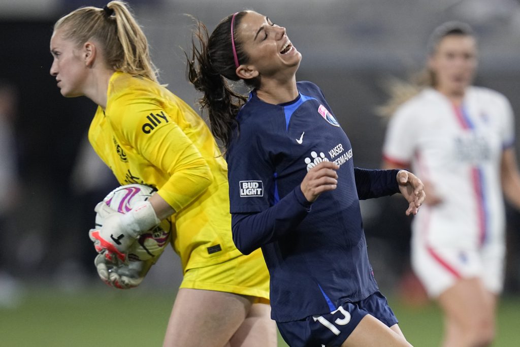 San Diego Wave forward Alex Morgan, center, reacts after a missed opportunity as OL Reign goalkeeper Claudia Dickey, left, controls the ball during the second half of an NWSL semifinal playoff soccer match against the OL Reign, Sunday, Nov. 5, 2023, in San Diego.