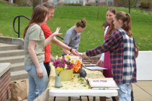 Lindsey Sylvania, a Waynesburg University psychology and youth ministry sophomore from Oakland, Md., receives a pin from EcoStewards vice president Garret Kunz during the university’s Earth Day celebration Tuesday.