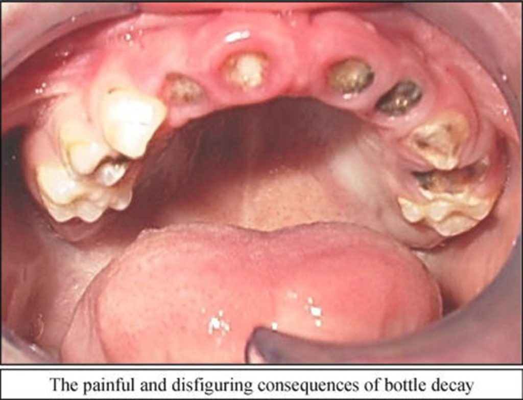 Geshay illustrated the problem by offering the scenario that an adult who is given 4 ounces of juice will likely drink it all in one gulp and produce 20 minutes of acid in the mouth. A child who is given the same 4 ounces of juice in a sippy cup will take tiny sips from the cup multiple times until it is finished. Each time this child takes a drink it produces 20 minutes of acid in the mouth. The compounding of this acid can lead to an erosion of the enamel and lead to cavities and tooth decay.