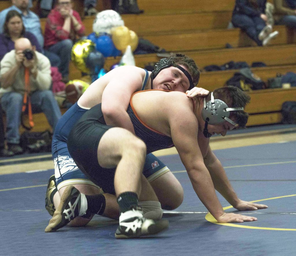 After Eric Holmes received a forfeit at 145 for the Bulldogs, Bruce Leonard of B-C pinned Justin Mattich in 2:50 at 152 to pull the hosts within one point.