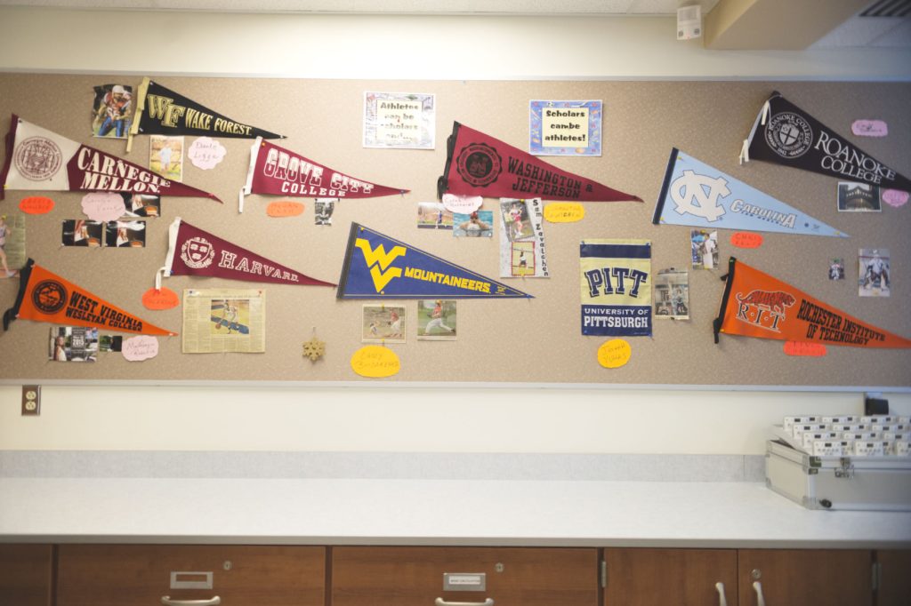 On the back wall of Iacconi’s classroom is her college wall, a bulletin board that she has curated since 2006 when a student gave her a picture of himself and a pennant from the college he chose to attend after graduation — Harvard University.