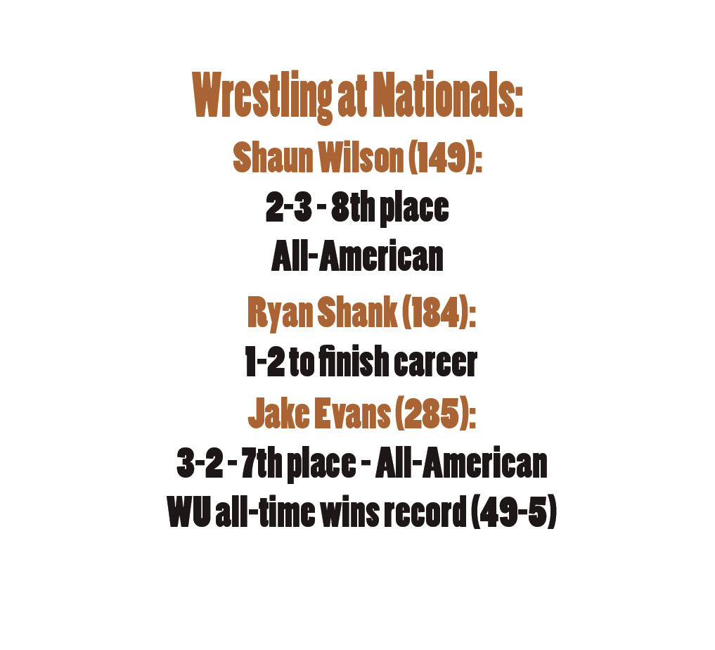 Waynesburg University wrestling head coach Ron Headlee and his assistant coaches joined senior Ryan Shank, sophomore Jake Evans and freshman Shaun Wilson at the NCAA Division III National Wrestling Championships in La Crosse, Wisconsin, last weekend. Evans and Wilson would both make the podium, finishing seventh and eighth, respectively.