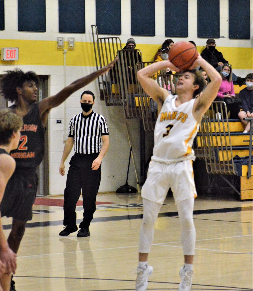 Carmichaels’ Chris Barrish takes a jump shot against Jefferson-Morgan during Friday night’s game at Carmichaels. Barish scored a game-high 36 points, including six 3-pointers, in the Mikes’ 81-68 win. (Photo by Rob Burchianti)