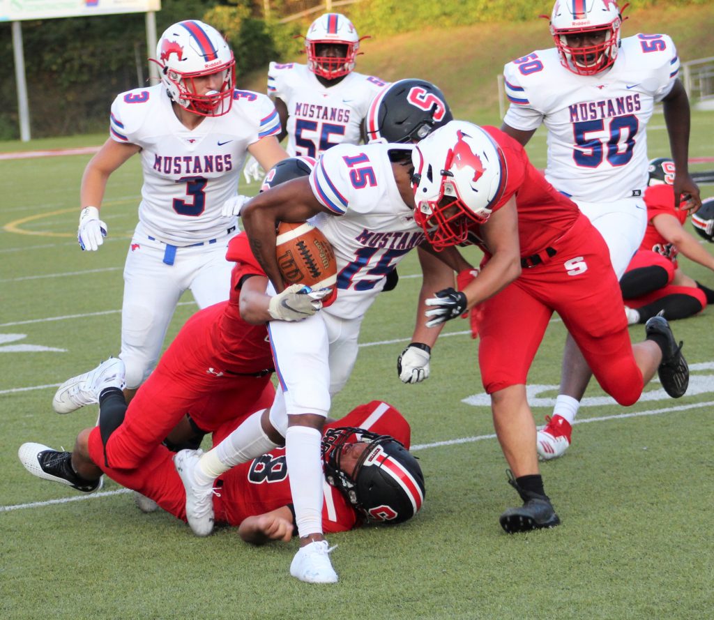 Eric Allen gained the first four of his 148 yards rushing to push the ball to the three-yard line. The Mustangs survived a mishandled snap for a two-yard gain by Allen, who was stopped just short of the goal line.