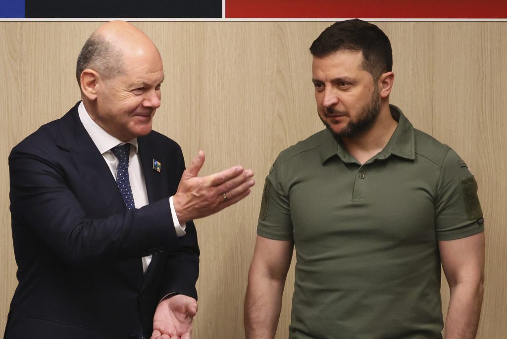 Ukraine's President Volodymyr Zelenskyy, right, meets with Germany's Chancellor Olaf Scholz during a NATO summit in Vilnius, Lithuania, Wednesday, July 12, 2023.