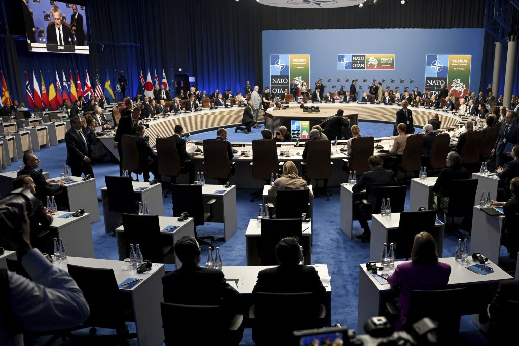 Participants attend a meeting of the North Atlantic Council with Partner Nations at a NATO summit in Vilnius, Lithuania, Wednesday, July 12, 2023.