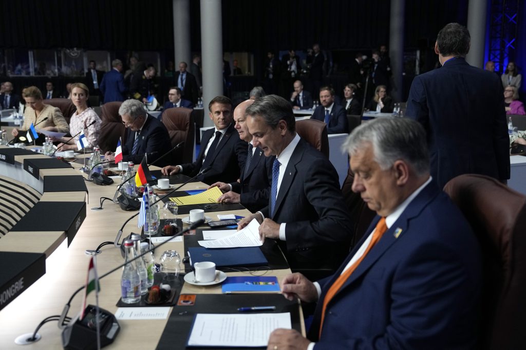 Hungary's Prime Minister Viktor Orban, right, attends a meeting of the North Atlantic Council with Partner Nations at a NATO summit in Vilnius, Lithuania, Wednesday, July 12, 2023. NATO leaders prepared to provide Ukraine with more military assistance for fighting Russia but only vague assurances of future membership as the alliance's summit draws to a close on Wednesday.