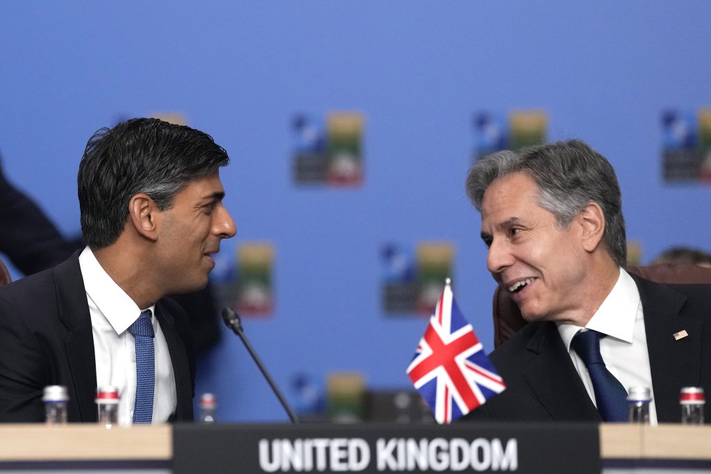 British Prime Minister Rishi Sunak, left, speaks with United States Secretary of State Antony Blinken during a meeting of the North Atlantic Council with Partner Nations at a NATO summit in Vilnius, Lithuania, Wednesday, July 12, 2023. NATO leaders prepared to provide Ukraine with more military assistance for fighting Russia but only vague assurances of future membership as the alliance's summit draws to a close on Wednesday.