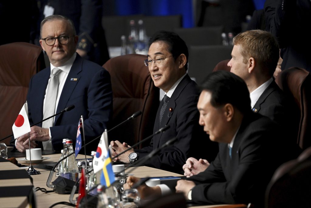 Left to right, Australia's Prime Minister Anthony Albanese, Japan's Prime Minister Fumio Kishida, New Zealand's Prime Minister Chris Hipkins, and South Korean President Yoon Suk Yeol, attend a meeting of the North Atlantic Council with Partner Nations at a NATO summit in Vilnius, Lithuania, Wednesday, July 12, 2023.