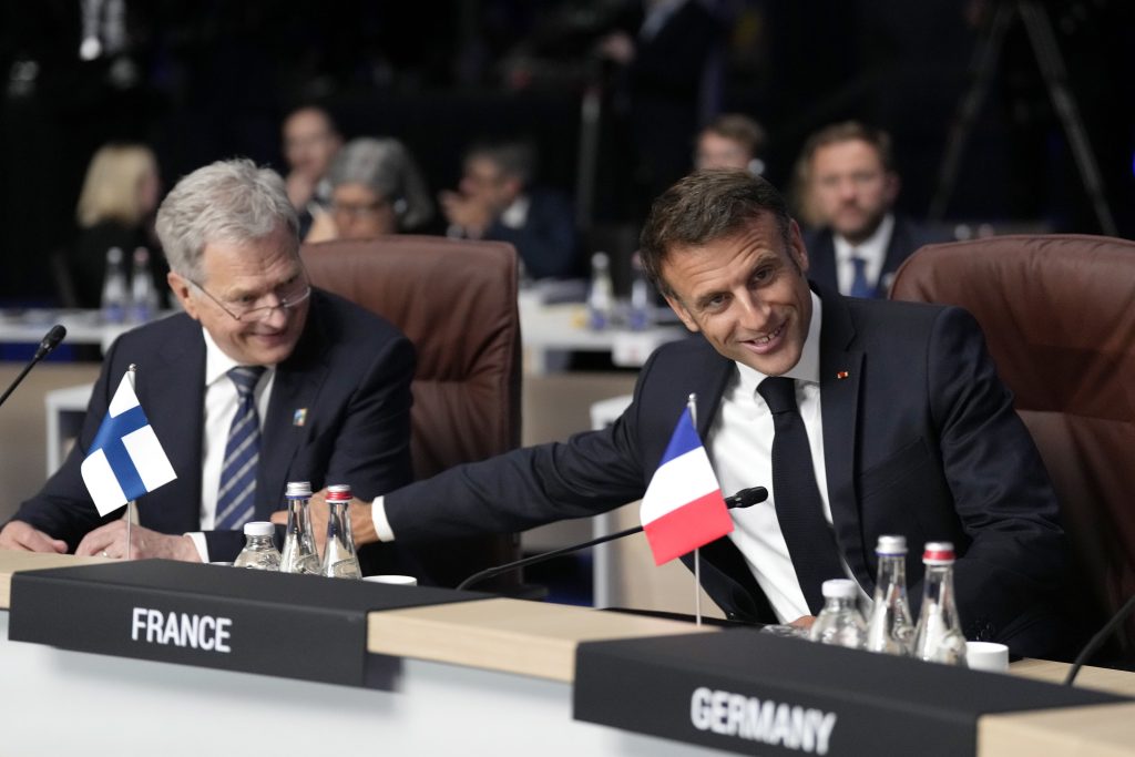 France's President Emmanuel Macron, right, speaks with Finland's President Sauli Niinisto during a meeting of the North Atlantic Council with Partner Nations at a NATO summit in Vilnius, Lithuania, Wednesday, July 12, 2023. NATO leaders prepared to provide Ukraine with more military assistance for fighting Russia but only vague assurances of future membership as the alliance's summit draws to a close on Wednesday.