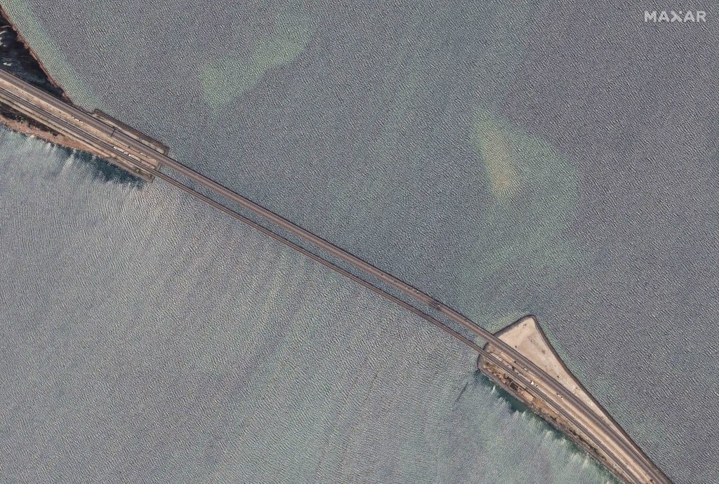 Satellite images taken Monday by Maxar Technologies showed serious damage to both eastbound and westbound lanes of the bridge across the Kerch Strait on the part nearest to the Russian mainland, with at least one section collapsed. The railroad bridge that runs parallel to the highway appeared undamaged.