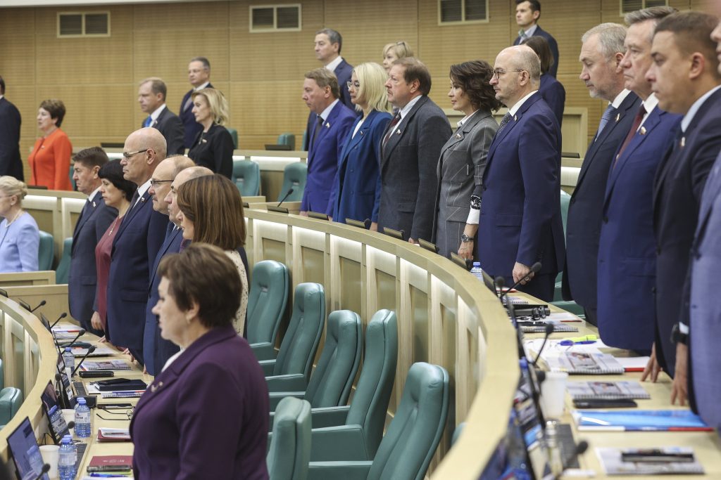 In this photo provided by The Federation Council of The Federal Assembly of The Russian Federation Press Service, lawmakers of Federation Council of the Federal Assembly of the Russian Federation listen to the national anthem at a session in Moscow, Russia, on Wednesday, July 19, 2023. The upper house of Russia's parliament has unanimously approved a bill outlawing gender-affirming procedures and sent the measure to President Vladimir Putin to be signed into law.