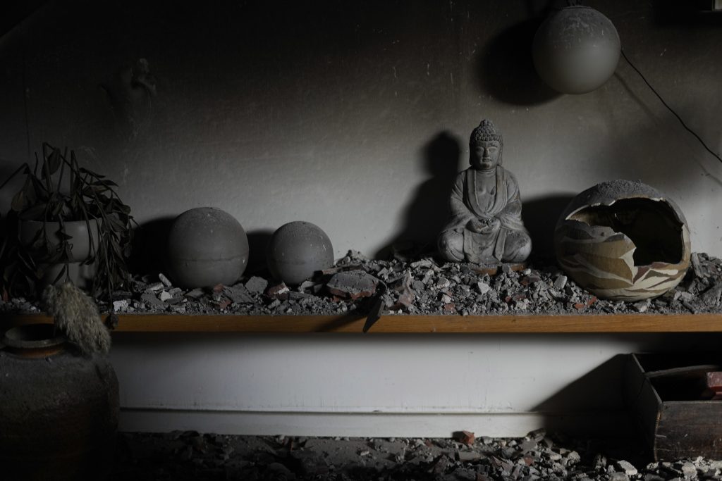 Though some houses are still standing, the kibbutz is uninhabitable. Birdsong is punctuated by buzzing drones overhead and artillery fire from the army base nearby. Rescue teams operate with soldiers to clear rubble and demolish badly damaged buildings.